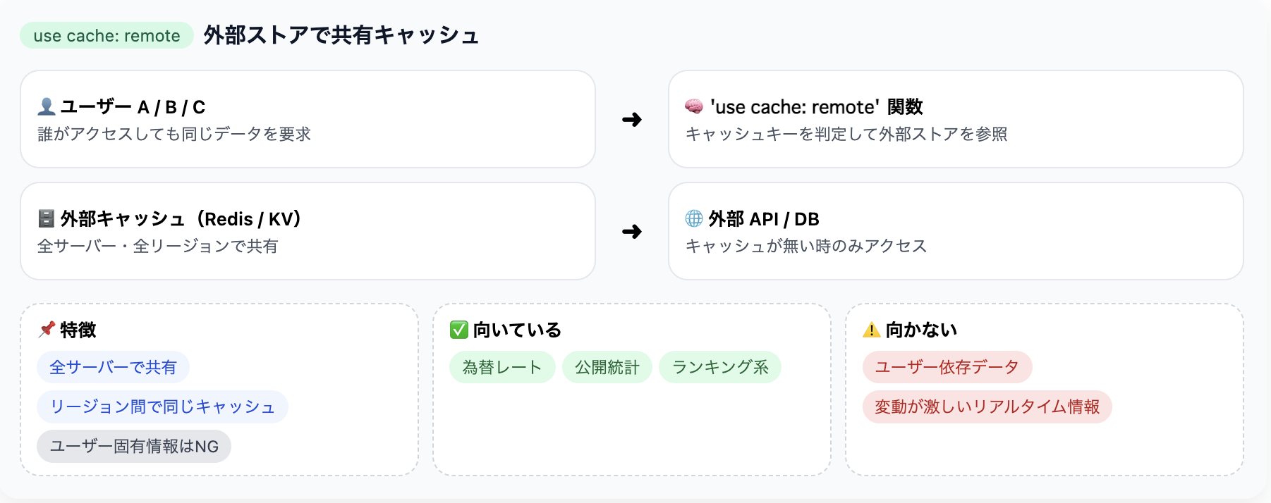 use cache: remote | 全サーバー・全リージョン | ❌ 使用不可 | 為替・ランキングのような共通データ |