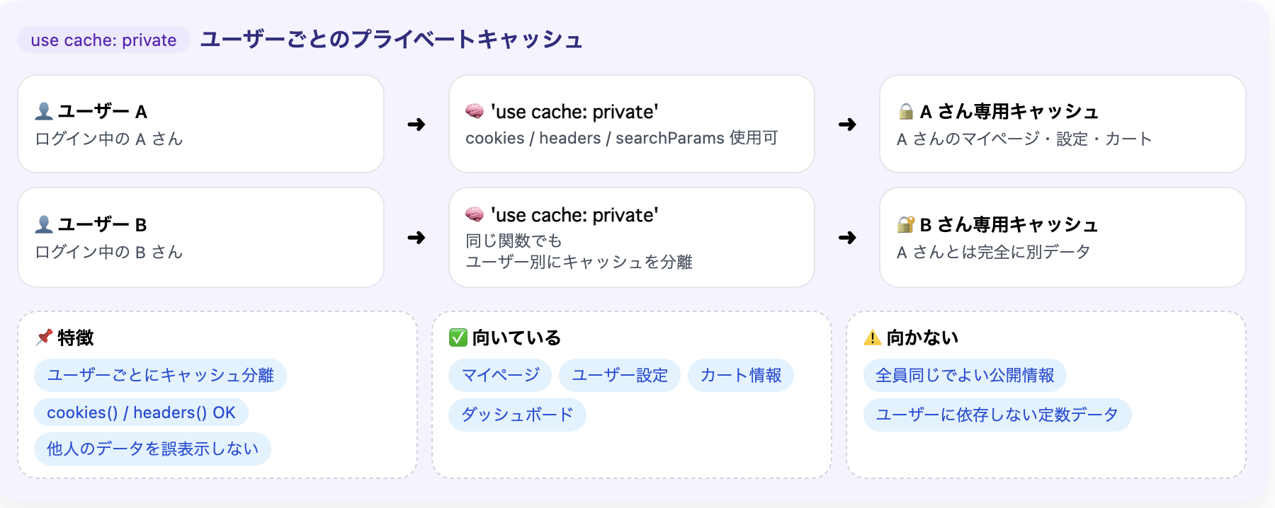 use cache: private | ユーザーごと | ✅ 使用可能 | マイページ・個別設定・カート |