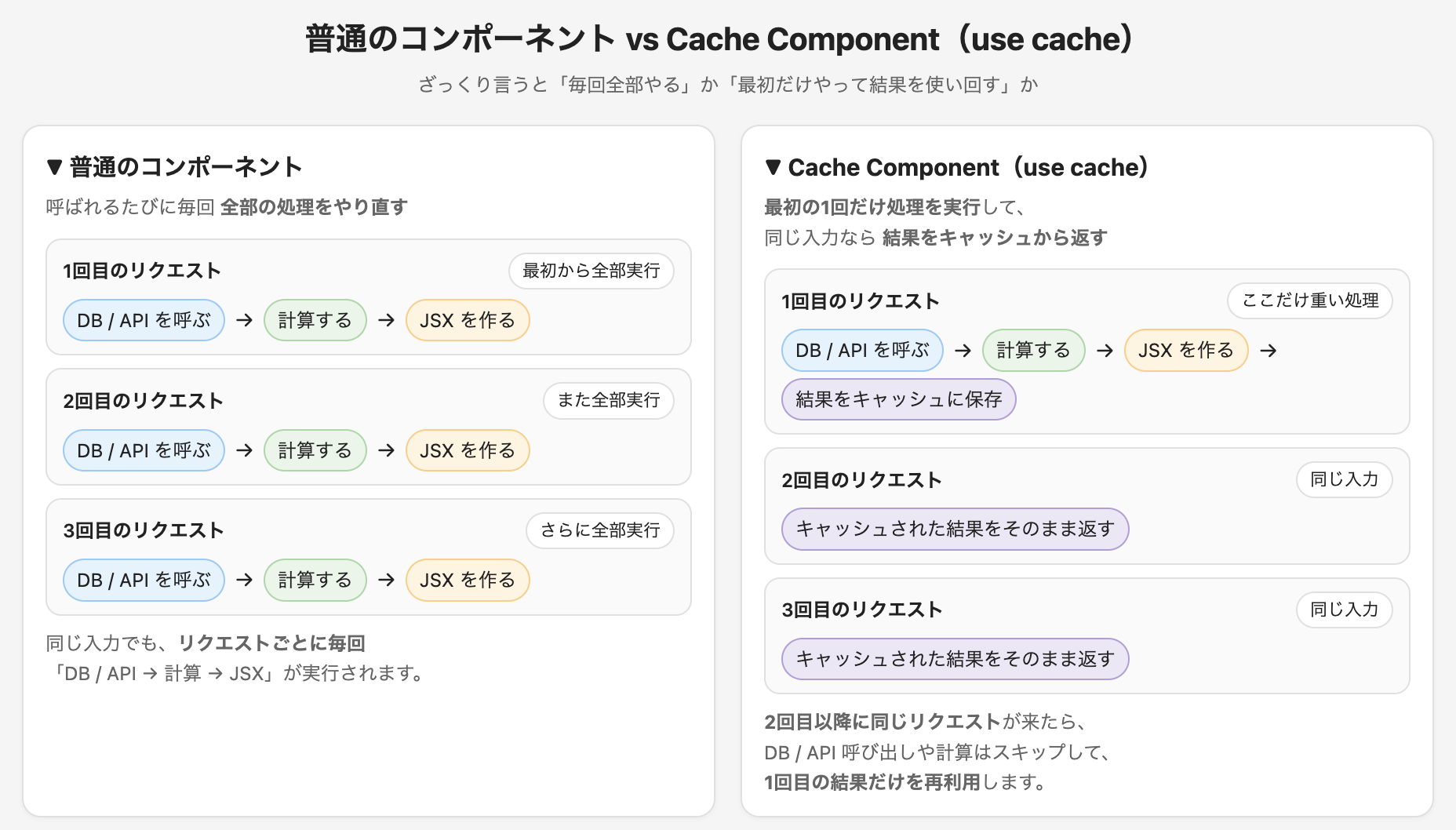 use cacheuse cache: remoteuse cache: private💡補足:Cache Components は RSC(サーバーコンポーネント)専用
