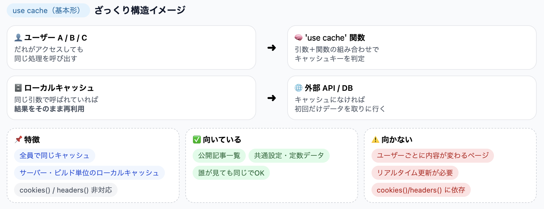 use cache | サーバー内 / ビルド単位 | ❌ 使わない前提 | 公開記事一覧・定数的データ |