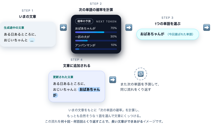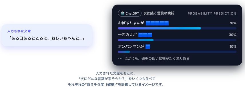 大枠の仕組みとしては次に来る言葉をただ予測しているだけです。